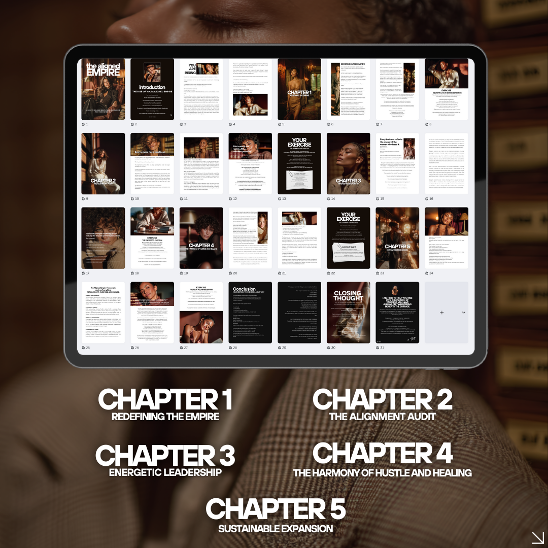 The Aligned Empire is a transformational self-leadership and business mindset ebook for women who want to grow sustainably — without burnout, hustle addiction, or self-betrayal.